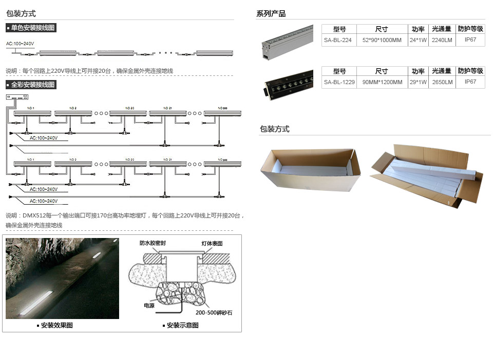 特征 ·完美散热设计,防水性能好,不易破坏 ·铝合金压铸灯体,黑色防腐漆,201不锈钢面环,5MM清光钢化玻璃,不锈钢螺丝 ·AC220V/DC24V供电,300MA恒流驱动,效率90% ·1.6MM高导热铝基板,内置恒流驱动,保证灯具品质恒久稳定 ·PMMA光学透镜,透光91%,多种发光角度可选。一体化防水设计,保护灯珠不受外界浸袭 ·通电常亮、内控变色、DMX512控制、PMW调光、可控硅调光 ·LED光源采用科锐、普瑞、晶元等国际一流芯片 ·光源140LM/W、5000小时光衰小3%,显指大小80,光色一致,两年内补货可保证光色一致 ·单边出线,专用防水出线罗丝,1.0平方橡胶线 ·硅胶垫圈结构防水和灯体内部灌导热硅胶+防水一体化透镜,双重防水,防护等级IP67 ·室温25°以上亮灯3小时,外壳温度45°,灯角温度不超过50° ·操作温度:-20°C + 50°C ·预计寿命:≥ 50000小时