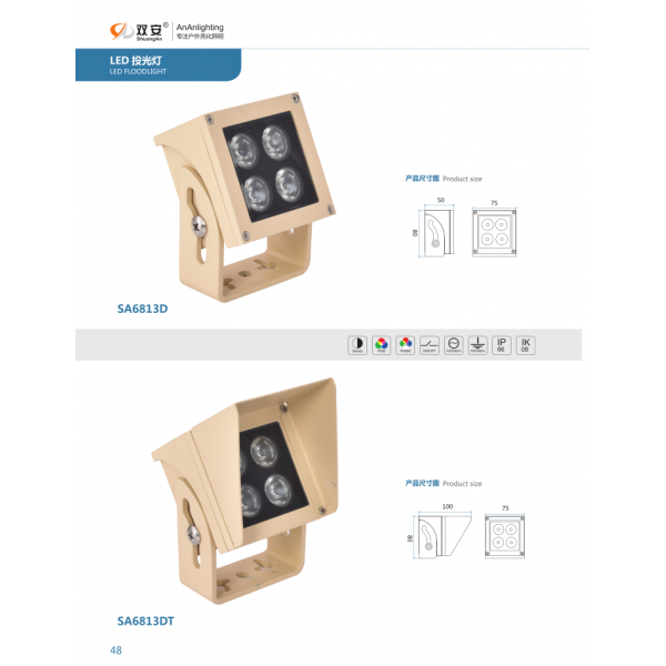 双安投光灯系列防水,防尘,防紫外线,耐压耐破裂,耐高低温,耐燃,超强抗冲击老化灯具;全彩可进行TTL系统控制,变化多彩,流水,梦幻效果,混光均匀,柔和,色彩绚丽